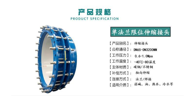 VSSJA-1(BF)單法蘭限位伸縮接頭是由松套伸縮接頭和一個(gè)限位短管組合而成。單法蘭松套限位伸縮接頭使用于一邊與法蘭連接,一邊與管道焊接,安裝時(shí)調(diào)整產(chǎn)品兩端與管道或法蘭的安